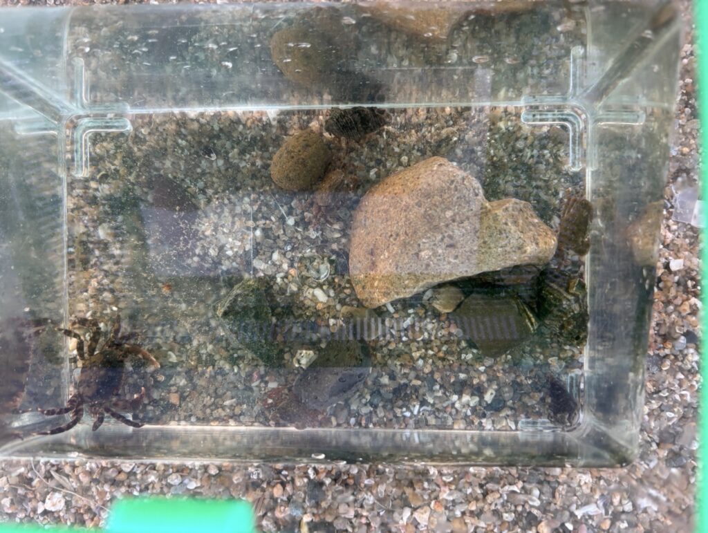 カニは糸の先にあるエサに素早く反応してハサミでつかんできます。ところが、ここからが勝負。そっと糸を持ち上げても、ほんの少しの衝撃でポロリと落ちてしまいます。子どもたちも「もうちょっとだったのに!」と何度も悔しがっていました。それでも工夫しながら粘り強く挑戦し、最終的には数匹のカニを釣り上げることに成功。小さなバケツに入れて観察すると、子どもたちの目はキラキラと輝いていました。